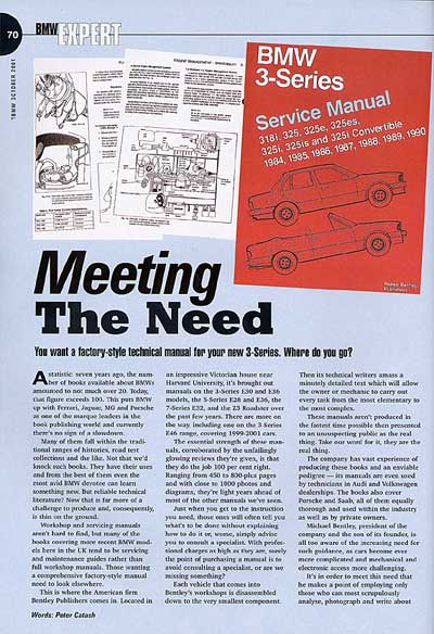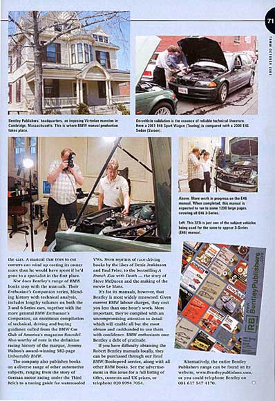 This is where the American firm Bentley Publishers comes in. Located in an impressive Victorian house near Harvard University, it's brought out manuals on the 3-Series E30 and E36 models, the 5-Series E28 and E34, the 7-Series E32, and the Z3 Roadster over the past few years. There are more on the way, including one on the 3-Series E46 range, covering 1999-2001 cars.