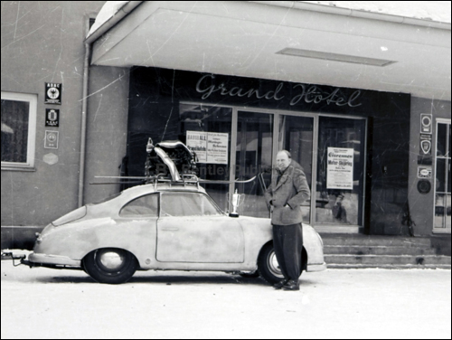 Otto Mathé in front of Zell am See"s Grand Hotel with Porsche 356/2-040. Photo courtesy of Automuseum Prototyp.